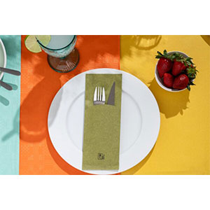 Νέο σχέδιο όπου αναδεικνύεται το μαχαιροπίρουνο. Οι θήκες Venetian παράγονται από 100% ανακυκλωμένο λείο χαρτί 90 gr/m2 με glitter. 100% ECO εμφάνιση της εικόνας του εστιατορίου και υψηλή παροχή υπηρεσίας στους πελάτες. Υγειονομική προστασία των μαχαιροπήρουνων από την έκθεση στο περιβάλλον. Μέγιστη οικονομία χρήσης με την 2φυλλη χαρτοπετσέτα πολυτελείας 30 x 34 cm. Τα μελάνια που χρησιμοποιούνται είναι νερού γεγονός που τα καθιστά αβλαβή και απολύτως ασφαλή για κάθε χρήση στην εστίαση.