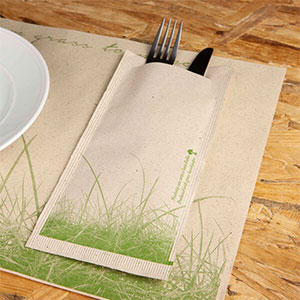 Οι θήκες Grass Paper παράγονται από ανακυκλωμένο χαρτί και γρασίδι 100 gr/m2 . Αναδεικνύουν μοναδικά την 100% ECO εμφάνιση της εικόνας του εστιατορίου και είναι πολύ ανθεκτικά στην χρήση τους. Υγειονομική προστασία των μαχαιροπήρουνων από την έκθεση στο περιβάλλον. Μέγιστη οικονομία χρήσης με την 2φυλλη χαρτοπετσέτα πολυτελείας 34 x 38 cm. Τα μελάνια που χρησιμοποιούνται είναι νερού γεγονός που τα καθιστά αβλαβή και απολύτως ασφαλή για κάθε χρήση στην εστίαση.