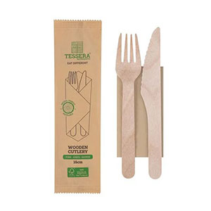 Ξύλινο κουβέρ από μαχαίρι, πιρούνι και χαρτοπετσέτα, τυλιγμένο σε χάρτινη συσκευασία.